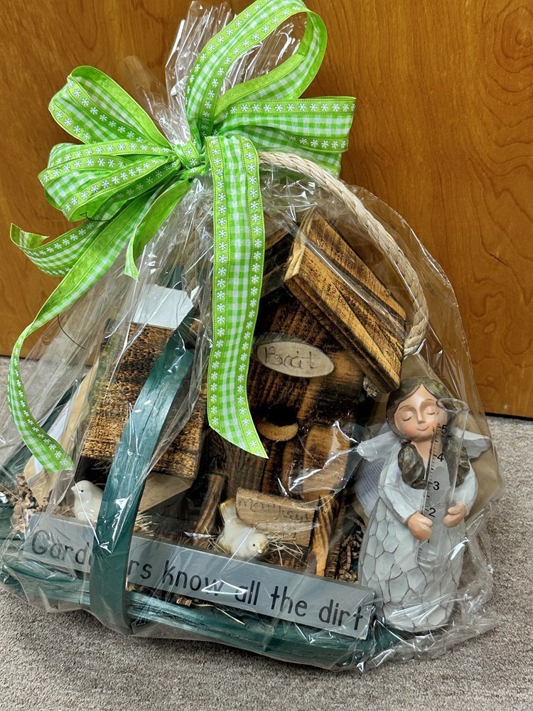 Gardner Basket includes: "Gardners Know All the Dirt" sign Bird Figurine Resin Angel Rain Gauge 2 Garden in a Bag Wooden Birdhouse Garden Tools
