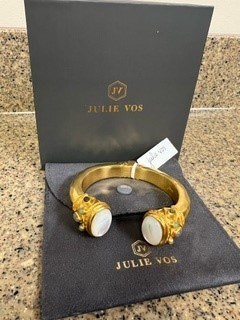 Sparkling rose-cut endcaps accented with pear shape gemstones on a luxuriously gilded cuff. 24K gold plate, imported glass Regular: 2.5 inch diameter Our jewelry is hand set in 24k gold plate over nickel-free brass and sealed to prevent tarnish. Maintain the jewelry's beautiful luster by avoiding contact with lotion, perfume, makeup, or any harsh cleaning products. Remove your jewelry before showering, swimming, exercising, or washing your hands. Julie Vos hallmark - 5 out of 5 stars