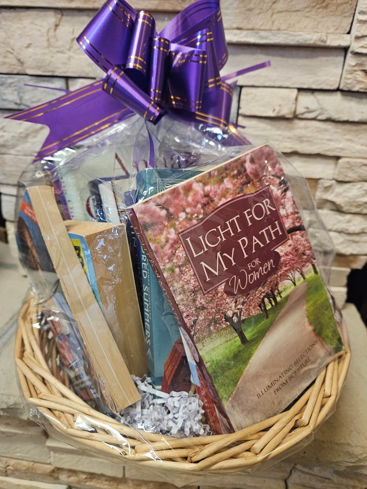 Used Book Basket includes: Gifted Hands The Ben Carson Story by Ben Carson, MD Light for My Path for Women scripture selections A Walk to Remember by Nicholas Sparks Wanderlust by Danielle Steele The Edge of Town by Dorothy Garlock A Hundred Summers by Beatriz Williams The Rooster Bar by John Grisham Flora's Suitcase by Dalia Rabinovich Daily Guideposts devotional 2013 Blessings by Anna Quindlen Mounting Fears by Stuart Woods Collateral Damage by Stuart Woods