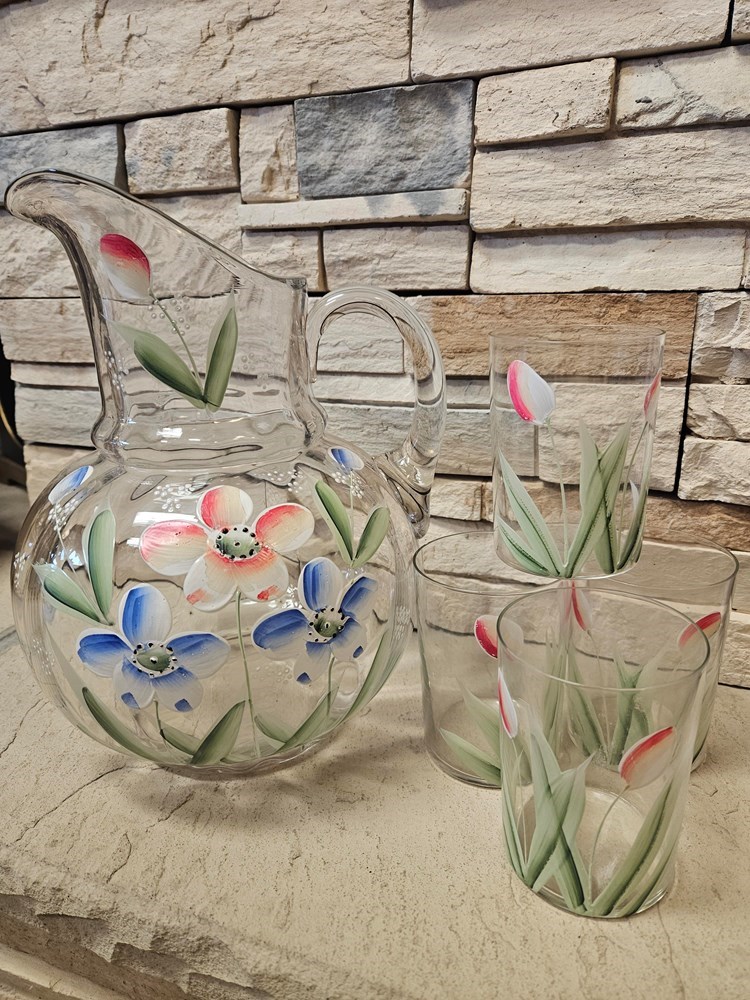 Hand Painted Clear Glass Pitcher with 4 juice glasses