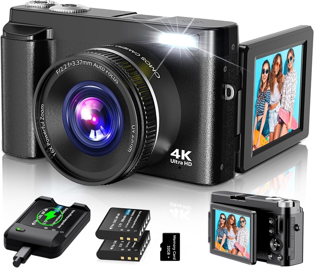 About this item 4K DIGITAL CAMERA WITH AUTOFOCUS: The newest 4K digital camera for photography captures videos in 4K resolution and snaps ultra HD 48MP images. With Autofocus and 16X digital zoom, every detail is crisp, clear, and vibrant even captured from a distance. 180° FLIP SCREEN AND PORTABLE: Our 4k camera for photography offers a 3.0-inch IPS 180° flip screen, ideal for selfie enthusiasts and vlogging creation. Designed for travel and everyday use, this compact travel camera for pictures is built to last. Its small size and durable construction make it a reliable companion for capturing memories on the go. MULTIFUNCTIONAL PHOTOGRAPHY CAMERA: The 4K digital video camera features a date stamp, exposure compensation (-3.0 to +3.0), video pause and playback, time-lapse, slow-motion, giving your videos a creative edge. Additional features like a fill light, Anti-shake, 3 continuous shooting, smile & face detection, beauty face, self-timer, and various filters encourage you to stretch your creative boundaries. WEBCAM AND EASY TRANSFER: This 4K vlogging camera for YouTube doubles as a webcam, perfect for live streaming, video chats, and vlogging. You can connect the photo camera to your computer via an USB cable for easy file download, sharing your experiences with friends instantly. With 2 spare rechareable batteries and 1 charging station, never worry about power shortage. A PERFECT GIFT WITH A HASSLE-FREE WARRANTY: User-friendly and versatile, this portable digital camera for teens is an ideal gift for kids, beginners, amateurs, teens, and seniors, fulfilling daily shooting needs easily. Enjoy our worry-free 18-month replacement and refund warranty. Our prompt customer support team is ready to assist you in under 12 hours!