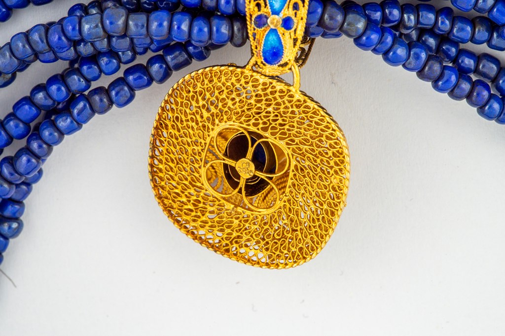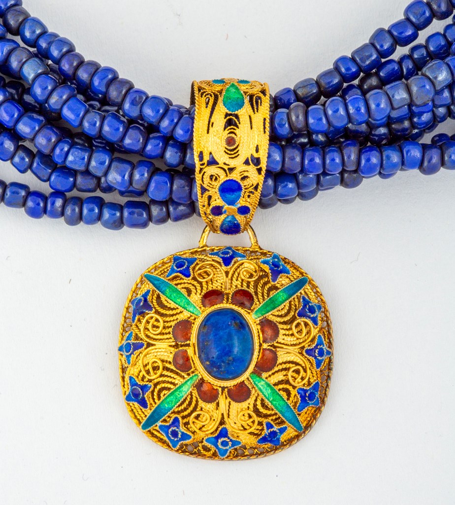An Enamel, Lapis, Vermeil and Beaded Necklace with delicate wire work, bright enamel accents and a center oval lapis cabochon stone suspended from a vibrant blue glass bead multi-strand necklace.
