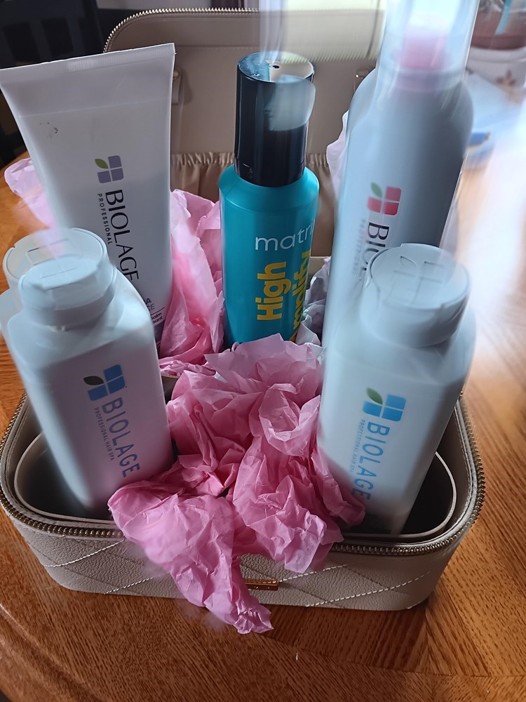 Give your hair the treatment that it needs with this Biolage and Matrix product hair basket. Includes Biolage Volume Boost Shampoo and Conditioner, Hydra Source Conditioner, Matrix High Amplify Mousse for Volume, Biolage Complete Control Hair Spray and travel bag.