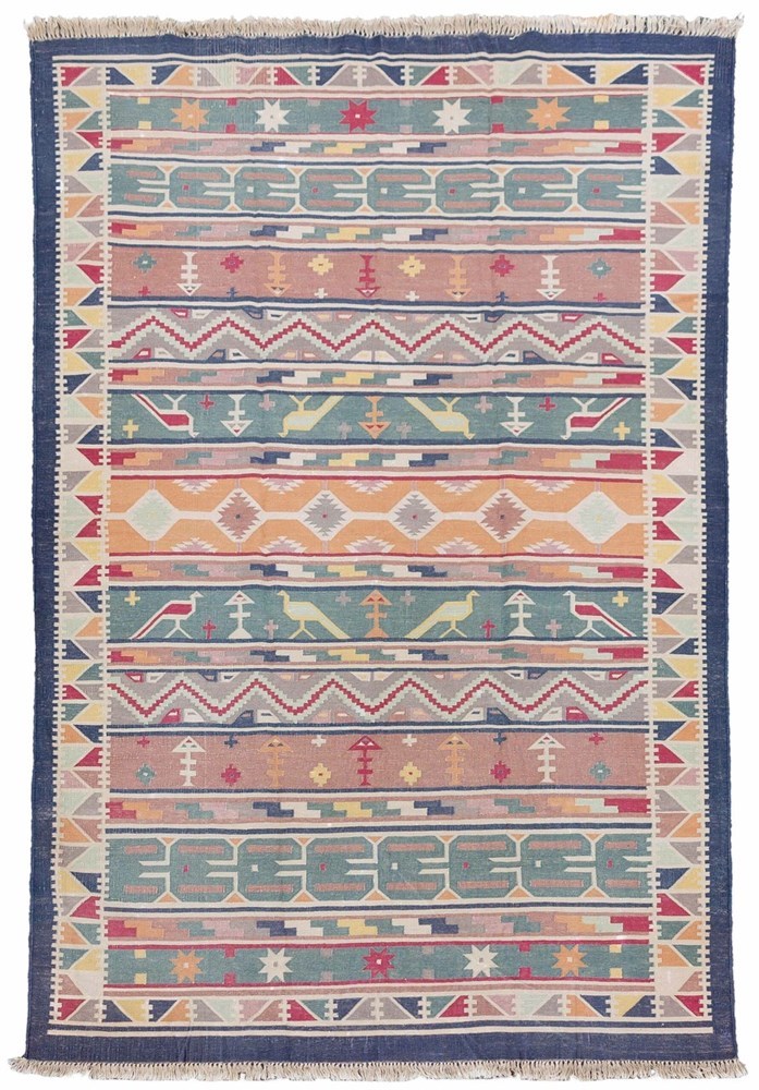 Dhurrie rugs are woven in a slit tapestry technique often referred to as “kilim”. Woven in cotton, this is a late 20th centuryin excellent condition. It’s a revival of a centuries old weaving tradition and many of the motifs are taken from tribal rugs. 5'6"x8'6" India Late 20th Century